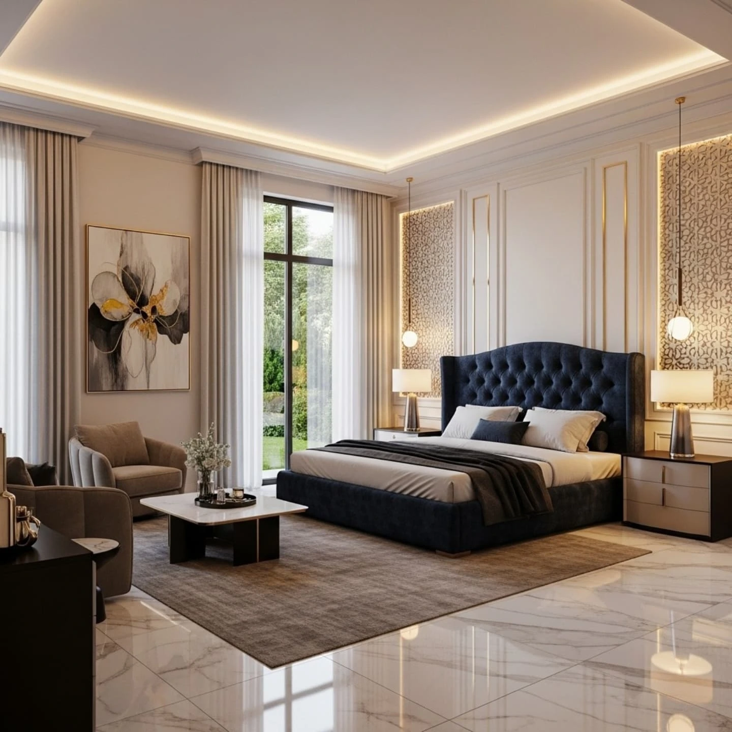 Get ready to be amazed by this fancy bedroom design! It truly shows modern luxury. It has rich details and an elegant look. The bold dark blue bed grabs your eye.